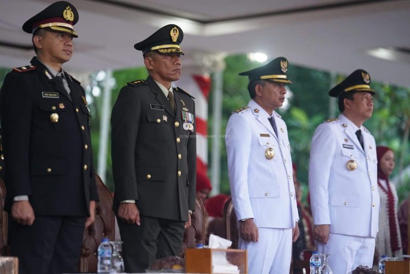 Sasaranfublik.com, Muaro Jambi – Bupati Muaro Jambi, Dr. Bambang Bayu Suseno, bersama Wakil Bupati Muaro Jambi Junaidi H. Mahir, dan Sekretaris Daerah Muaro Jambi, H. Budhi Hartono, menghadiri upacara penurunan bendera 17 Agustus 2025 di Lapangan Pendopo Kantor Bupati Muaro Jambi Bukit Cinto Kenang, pada Minggu (17/8/2025). Kapolres Muaro Jambi, AKBP Heri Supriawan, S.I.K., M.H bertindak sebagai Inspektur Upacara.